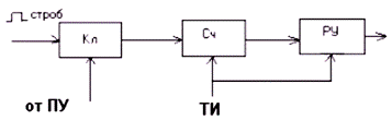 На ключ поступают стробирущие импульсы. Управление ключом производится сигналом с выхода порогового устройства. Импульсы прошедшие ключ подсчитываются счетчиком. По приходу тактового импульса решающее устройство считывает показание счетчика, сравнивает его с пороговым значением и принимает решение о значащей позиции на текущем интервале.