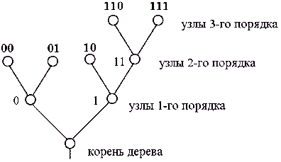Две ветви, идущие от корня дерева к узлам первого порядка, соответствуют выбору между “0” и “1” в качестве первого символа кодового слова: левая ветвь соответствует “0”, а правая – “1”. Две ветви, идущие из узлов первого порядка, соответствуют второму символу кодовых слов, левая означает “0”, а правая – “1” и т. д. Ясно, что последовательность символов каждого кодового слова определяет необходимые правила продвижения от корня дерева до концевого узла, соответствующего рассматриваемому сообщению.