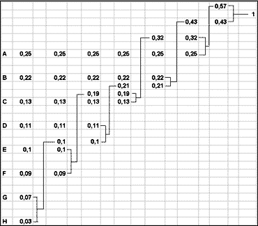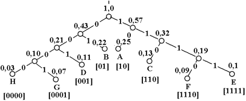 4. Проводя линии, объединяющие сообщения и образующие последовательные подмножества, получаем дерево, в котором отдельные сообщения являются концевыми узлами. Соответствующие им кодовые слова можно определить, приписывая правым ветвям объединения символ “1”, а левым - “0”. Впрочем, понятия “правые” и “левые” ветви в данном случае относительны.