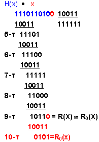Как видим из примера, процедура деления одного двоичного числа на другое сводится к последовательному сложению по mod2 делителя [10011] с соответствующими членами делимого [10101], затем с двоичным числом, полученным в результате первого сложения, далее с результатом второго сложения и т.д., пока число членов результирующего двоичного числа не станет меньше числа членов делителя.