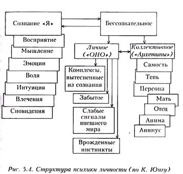 По мнению К. Юнга, психика личности содержит две составляющие (рис. 5.4): сознание и бессознательное. Однако, придавая, как и 3. Фрейд, решающее значение в регуляции поведения бессознательному, К. Юнг выделил в нем наряду с личной формой («ОНО») еще и коллективную («Архетипы»).