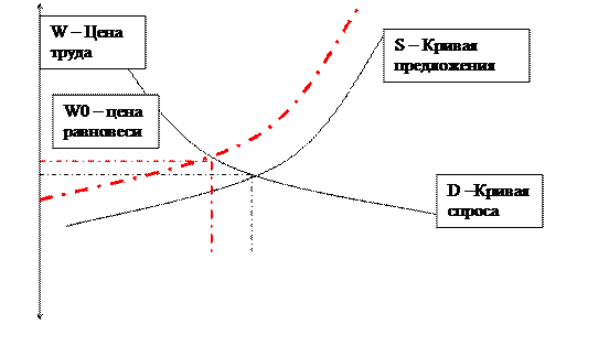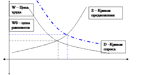 Увеличение предложения с S до S1 ведет к увеличению зарплаты, хотя занятость при этом уменьшится с Lp до Ln