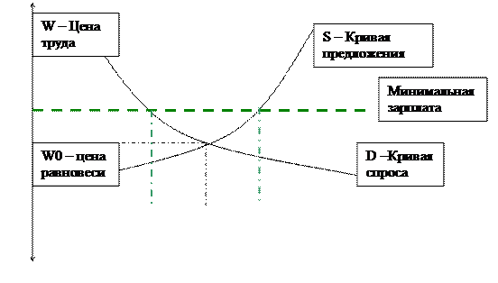 Несмотря на гарантированный уровень жизни, установление минимальной ставки оплаты труда выше равновесного уровня приводит к разрыву между спросом и предложением на рынке труда и появлению безработицы.