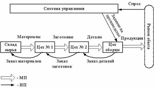 Толкающие модели управления потоками характерны для традиционных методов организации производства. Возможность их применения для логистической организации производства появилась в связи с массовым распространением вычислительной техники. Эти системы, первые разработки которых относят к 60-м годам, позволили согласовывать и оперативно корректировать планы и действия всех подразделений предприятия: снабженческих, производственных и сбытовых с учетом постоянных изменений в реальном масштабе времени.
