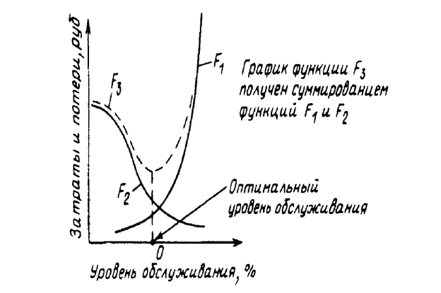 Графически оптимальный размер уровня сервиса можно определить, построив суммарную кривую F3, отражающую поведение затрат и потерь в зависимости от изменения уровня обслуживания