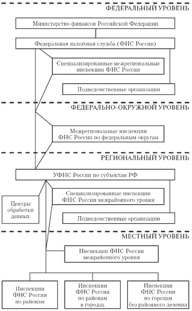 В структуре налоговых органов можно выделить четыре уровня (федеральный, федерально-окружной, региональный и местный), соответствующих уровням государственного управления и административно-территориальному делению Российской Федерации.