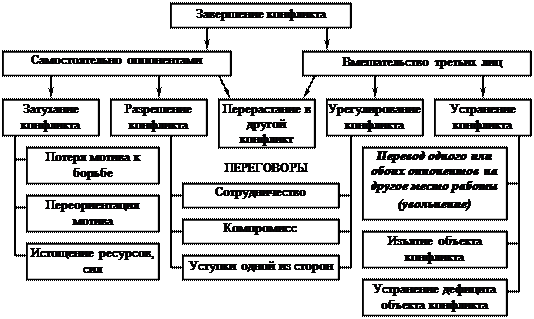 Общим понятием, описывающим финал конфликта, является понятие завершение конфликта, т. е. это – прекращение его существования в любой форме.