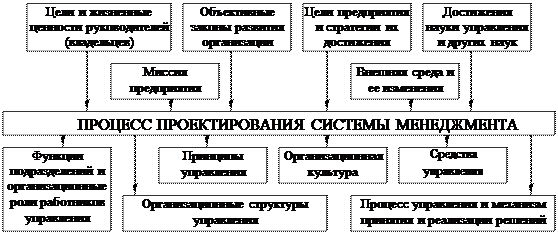 Процесс проектирования систем менеджмента (рис. 1) – это преобразование информации о состоянии и перспективах развития внешнего окружения предприятия, его миссии, целях деятельности и избранных стратегиях их достижения, жизненных целях и ценностных ориентациях его владельцев и (или) руководителей, объективных законах развития организаций и их систем управления; достижениях науки управления и других гуманитарных наук во взаимосвязанные модели. К основным компонентам системы управления предприятием относятся: