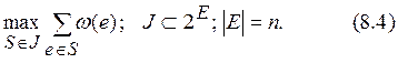 Значение функции w (е) будем называть весом элемента еÎ Е. Задача 8.3 может быть переформулирована так: найти допустимое подмножество SÎ J с наибольшим суммарным весом.