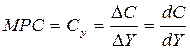 Величиной, связывающей текущее потребление и доход, выступает предельная склонность к потреблениюМРС (marginal propensity to consume), которая показывает отношение изменения текущего потребления к изменению дохода. Другими словами данный показатель характеризует реакцию потребителя на изменение дохода.