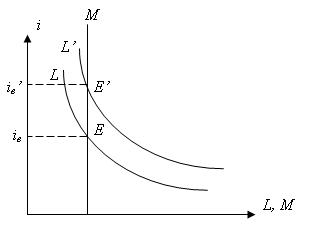 В случае если национальный доход увеличится, то функция трансакционного спроса возрастет и сместит функцию совокупного спроса вправо: L’. Новая ситуация равновесия Е’ будет характеризовать более высокую равновесную процентную ставку ie’.