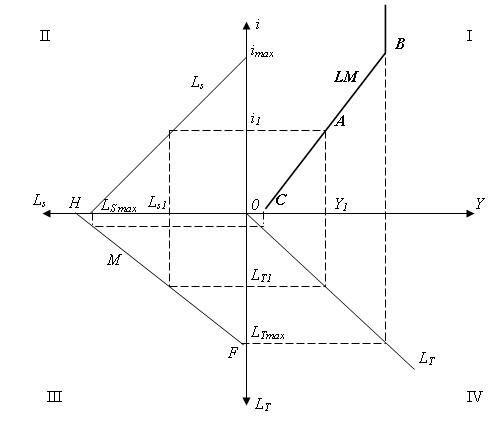 Также как и линия IS, линия LM не является графическим отображением функции дохода от ставки процента. Эта линия получается путем проекции функций трансакционного и спекулятивного спросов в первый квадрант. Поэтому она показывает, как должен измениться доход при изменении ставки процента (или наоборот, как должна измениться ставка процента при изменении дохода), чтобы на денежном рынке сохранилось равновесие.