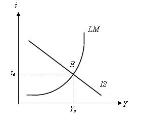 Точка пересечения этих линий дает равновесные значения процентной ставки iе и национального дохода Yе, соответствующие общему равновесию на товарном и денежном рынках одновременно.