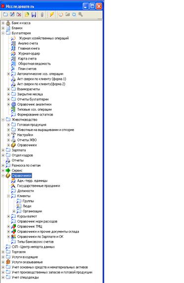 Выполнение большинства операций в программе «НИВА-СХП» происходит с помощью главного меню, которое называется «Исследователь». Данное меню располагается с левой стороны программы. Вид главного меню изображен на рис. 2.1. Пользование данным меню довольно простое: стоит лишь навести курсор мышки на необходимый показатель и нажать дважды ее левую кнопку, как появится следующая выборка показателей, из которых опять следует выбрать искомый объект, а после его обнаружения, перейдя в правое окно программы, можно заполнить или просмотреть необходимые данные. На этапе внедрения программы необходимо обязательно заполнить некоторые справочники.