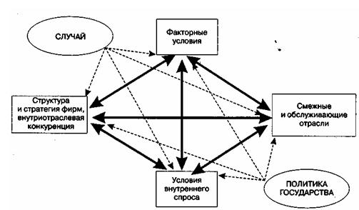 Модель «конкурентного ромба», отражает систему детерминант национального конкурентного преимущества (рис. 7.1). Ответом на вопрос, почему государства добиваются успеха той или иной области, служат четыре свойства страны, имеющие общий характер и формирующие среду, в которой конкурируют местные компании. Среда может способствовать созданию конкурентных преимуществ, а может и препятствовать их появлению.