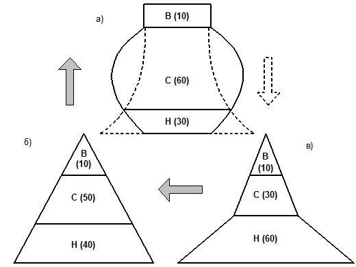 Другим важнейшим фактором, влияющим на процесс идентификации личности, выступает социальная (классовая) структура общества [26]. С некоторой условностью социум можно представить как систему, состоящую из трех классов – высшего, среднего и низшего. Соотношение между классами не является постоянным, и в различных типах социальных систем значительно отличается (см. рис. 6).