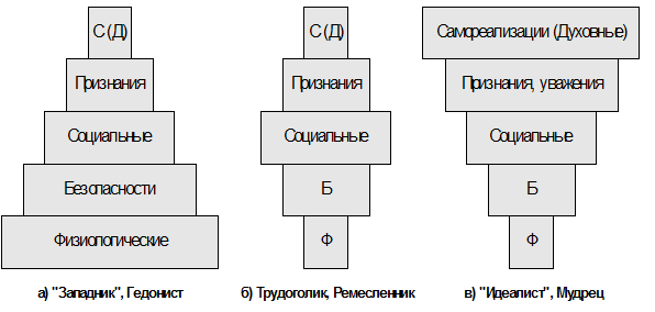 Помимо социально-классовой структуры общества важным фактором организационного поведения выступает композиция потребностей личности. Опираясь на пирамиду иерархии потребностей, предложенную Абрахамом Маслоу (1908 – 1970), выделим три типа личности (рис. 7).