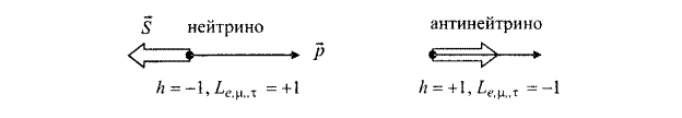 Рис. 2.2. Спиральности нейтрино и антинейтрино. Нейтрино –левополяризованная частица, антинейтрино –правополяризованная частица.
