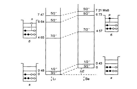 . Схематически показано расположение нуклонов по уровням в ядерной потенциальной яме для изодублетов основных (а) и возбуждённых (б) состояний