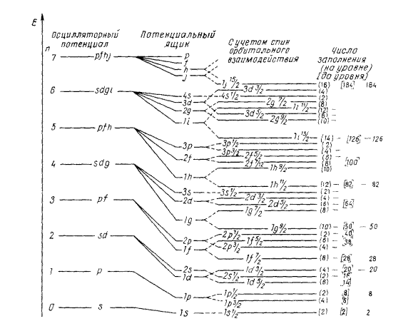 В 1947 г. магические числа удалось теоретически обосновать с помощью представления об одночастичных орбитах в ядрах. Это сделали М. Гепперт-Майер[6] и Дж. Иенсен[7]. Они сообразили, что для объяснения существования замкнутых оболочек с магическими числами 50, 82 и 126 следует учитывать спин-орбитальные взаимодействия. В простой модели ядерных оболочек предполагается, что нуклоны движутся независимо друг от друга сферически-симметричном потенциале ядра. При этом пренебрегают взаимодействием между отдельными нуклонами, но явно учитывают вид волновых функций нуклонов в эмпирическом усреднённом потенциале. Магические числа возникают из-за того, что энергетические уровни (как и в атомах) группируются в оболочки и полностью заполненные оболочки являются относительно стабильными образованиями. Термин «магические» исторически связан с тем, что в течение длительного времени не удавалось построить оболочки с нужными числами заполнения.