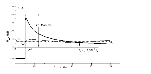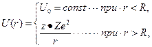 Будем исходить из идеализации, что a-частица уж существует внутри ядра. При такой идеализации ядро состоит из дочернего ядра и a-частицы. На расстоянии от ядра, где практически перестают действовать ядерные силы, остается только кулоновское отталкивание. На малых расстояниях от ядра отталкивание должно перейти в притяжение, обусловленное ядерными силами, иначе a-частицы в ядре не могли бы удержаться. В простейшем приближении модельный потенциал U(r) принимается равным