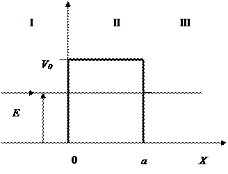 Пусть частица с энергией Е движется вдоль оси х от -∞ к +∞ и в интервале от 0 до а встречает прямоугольный потенциальный барьер высоты V0. Движение частицы будет описываться стационарным уравнением Шредингера