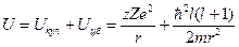 Центробежный барьер. Во всем изложенном выше предполагалось, что a -частица вылетает из ядра с нулевым орбитальным моментом импульса, т. е. в s–состоянии (l=0). Пусть теперь l¹0. В классической физике орбитальный момент можно учесть, если перейти в систему отсчета, которая вращается вместе с частицей. В этом случае к потенциальной функции нужно добавить центробежную потенциальную энергию Uцб = L 2/(2 m r2), где L - момент импульса. В квантовой механике можно поступить также, но учесть квантование момента по формуле L 2 =