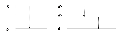 Переход ядра из возбужденного состояния в нормальное может быть однократным, когда ядро после испускания одного кванта сразу переходит в нормальное состояние (рис. 5.5 а). Но снятие возбуждения может быть и каскадным, когда переход осуществляется в результате последовательного испускания нескольких g-квантов (рис. 54.5 б).