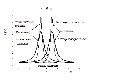 Рис. 5.8. Излучение и поглощение g-квантов с учётом доплеровского уширения исходной линии и эффекта сдвига за счёт отдачи ядра.