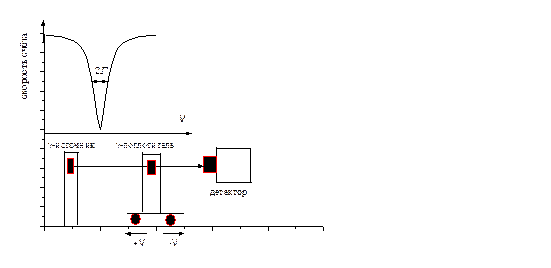 Детектор g - квантов регистрирует g -кванты, испускаемые источником и проходящие сквозь поглотитель, который может двигаться относительно источника с переменной скоростью v (+ v - навстречу g -квантам и – v –по направлению их движения). Поскольку при движении поглотителя частота n и энергия E=hn падающих на него g - квантов меняются вследствие эффекта Доплера: