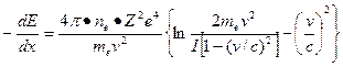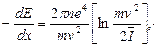 Здесь -dE – энергия, теряемая частицей на длине dx; ne - число электронов в 1 см3 тормозящего вещества; me - масса электрона; Ze и v – соответственно заряд и скорость тяжелой заряженной частицы; I - средний потенциал возбуждения атомов тормозящего вещества.