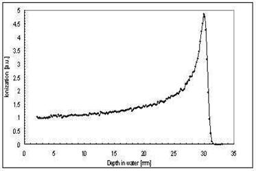 Кривая отражает динамику взаимодействия частицы с веществом. Основные потери энергии связаны с ионизацией заряженной частицей атомов вещества, сечение этого процесса растёт с падением энергии, вследствие чего основную часть энергии частица теряет перед моментом остановки. Это обстоятельство используется в протонной терапии, для того чтобы сосредоточить основную дозу в поражённой ткани внутренних органов, минимально облучая здоровые клетки, расположенные ближе к поверхности.