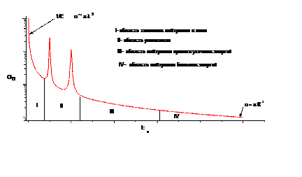 Взаимодействие нейтронов с веществом в значительной степени зависит от их энергии. При больших энергиях (En >10МэВ) длина волны нейтрона меньше радиуса ядра (R) и поэтому эффективное сечение определяется лишь поперечными размерами рассеивающего ядра (s@pR2). Наоборот, при малых энергиях, когда длина волны нейтрона значительно больше размеров ядра, эффективное поперечное сечение определяется длиной волны рассеиваемого нейтрона (s@pl2). Схематическая зависимость поперечного сечения взаимодействия нейтронов от энергии (функция возбуждения) представлена на рис. 6.5.