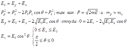 Рассмотрим процесс замедления нейтронов. Для простоты в качестве замедляющей среды будем использовать водород (вода). Связь между энергией первичного нейтрона Е0 и его импульса Р0, с энергией протона отдачи Ер и энергией рассеянного на ядре атома среды нейтрона Еn легко найти из законов сохранения энергии и импульса.