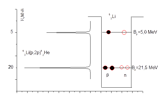 Рис. 8.5. Схема, описывающая прямую реакцию 6Li(p,2p)5He. Слева спектр протонов, справа исходное расположение нуклонов в потенциальной яме ядра 6Li.
