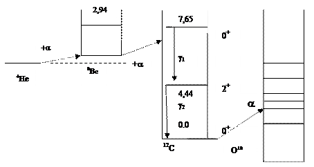 Рис. 9.2. Схема образования ядра 12С через резонансное состояние 7,65 МэВ за счёт тройной гелиевой реакции:
