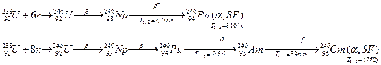 В 1952 г. США произвели испытание водородной бомбы, в которой происходит сгорание dT -смеси при температуре порядка 108 градусов в очень короткий промежуток времени ~10-6 сек. В течение такого короткого промежутка времени через урановую оболочку бомбы проходит поток нейтронов, на много порядков превышающий поток нейтронов в ядерных реакторах за то же время. В радиоактивной пыли, образовавшейся при взрыве, были обнаружены ранее неизвестные изотопы плутония 244Pu и 246Pu. Они образуются в результате захвата ядром 238U сразу шести или восьми нейтронов с последующим b--распадом