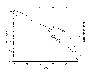 Рис. 9.3. Распределение плотности и температуры внутри Солнца (RQ - радиус Солнца) |