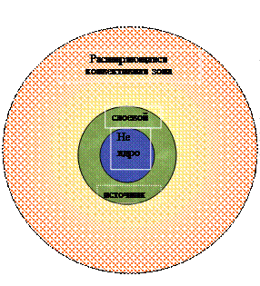 Первоначально в вырожденном ядре происходит превращение гелия в углерод и кислород. Кроме того, имеется тонкая гелиевая оболочка, в которой идут ядерные реакции, а вокруг неё водородная – также с ядерными реакциями. Внешний водородный слоевой источник соседствует с глубокой конвективной зоной, которая перемешивает всё пространство от слоевого источника до поверхности, радиус которой соизмерим с радиусом орбиты Юпитера(см. рис 9.5).