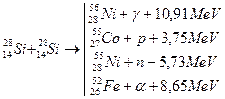 Перед взрывом в ядре звезды догорает 28Si с образованием 56Ni (см. рис 9.8), который, в свою очередь, в результате электронного захвата превращается в совокупность обогащённых нейтронами атомных ядер с массовым числами вблизи 50¸60.