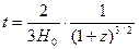 Красное смещение является также мерой времени, протекшего с начала расширения Вселенной до момента испускания света в галактике. Во Вселенной со средней плотностью, равной критической плотности, это время выражается формулой: