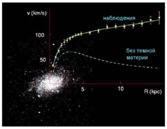 Таким образом, для объяснения наблюдаемых значений v(r) необходимо допустить существование ненаблюдаемой (несветящейся) материи, простирающейся на расстояния, превышающие в десятки раз видимые границы галактики и с массой, на порядок выше совокупной массы наблюдаемой светящейся материи галактики.