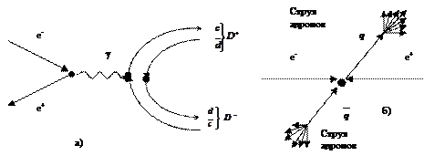 -кварки будут разлетаться в диаметрально противоположных направлениях с одинаковыми скоростями. Обрастая «извлечёнными из вакуума» кварками, первичная кварк-антикварк пара превращается в набор бесцветных адронов. Из закона сохранения импульса следует ожидать, что импульсы образовавшихся адронов должны быть направлены вдоль импульсов первоначально возникших кварк-антикварка. Таким образом, результатом лобового столкновения высокоэнергичных е+ и е- может быть образование двух компактных групп адронов, летящих в противоположных направлениях – так называемых адронных струй (см. рис.11.4).