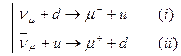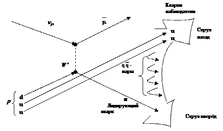 . В таких процессах переносчик слабого взаимодействия заряженный W + (или W -) бозон может поглотиться лишь кварком d (или u) нуклона, превратившись в кварк u (или d), который вылетая из нуклона даёт начало струе адронов.
