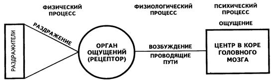 Ощущение возникает как реакция нервной системы на тот или иной раздражитель и, как всякое психическое явление, имеет рефлекторный характер. Участие физического, физиологического и психического процессов в возникновении ощущений показано на рис.1.