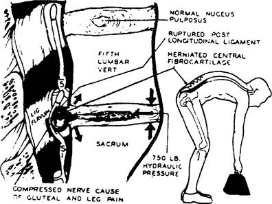 готовка, прополка и др.), а также при положении сидя (на стуле, за рулем автомобиля) наблюдаются усталостные свойства связок и мышц и они уже не могут полностью обеспечить функции. Иными словами, они растягиваются и не сокращаются до исходного положения. Это приводит и к изменению взаимного положения позвонков между собой и изменению положения студенистого ядра. Ядро под действием сжимающих сил передней части позвонков проталкивает ядро кзади, т.е. к каналу спинного мозга.