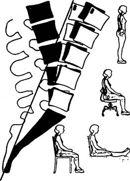 В положении сидя выравниваются лордозы и увеличиваются кифозы, т.е. происходит нарушение нормального расположения позвонков относительно друг друга. Поскольку при этом наблюдается и изменение положения плечевого пояса одно плечо выше- другое ниже/, изменение тазовых костей при сидении нога на ногу. то и напряжение мелких мышц позвоночника также будет различным, с одной стороны больше, а с другой - меньше.