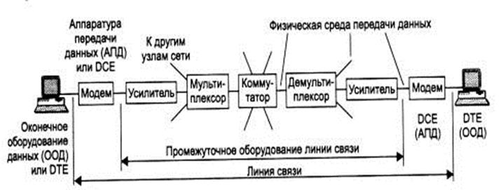 Линия связи (рис. 2.1) состоит в общем случае из физической среды, по которой передаются электрические информационные сигналы, аппаратуры передачи данных и промежуточной аппаратуры. Синонимом термина линия связи (line) является термин канал связи(channel).