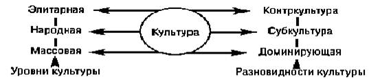 Культура любого современного общества представляет собой комплексную структуру, элементами которой являются образцы прошлых эпох, инновационные культурные формы, в том числе заимствованные у других народов, многообразное соотношение общего, особенного и индивидуального, наконец, культура светская и религиозная, пронизывающая все сферы духовного мира через обряды, традиции, обычаи. Такое переплетение существует с древних эпох, когда культура стала разделяться на религиозную и светскую, сельскую и городскую, национальную, элитную и народную (см. рис.).