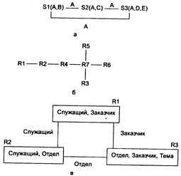 Рассмотрим, например, зависимости: Служащий —>Отдел и Отдел, Заказчик —> Тема. Это ситуация, показанная на рис.в). Для преодоления цикличности необходимо разделить роли атрибута Отдел, например, ввести атрибут «Отдел_служащего».
